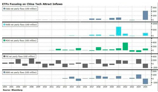 根据业内汇总的数据显示,2025年迄今,专注于中国科技股的美国主要上市ETF已吸引了大量资金流入,反观那些聚焦非科技板块的基金则遭遇了资金流出。