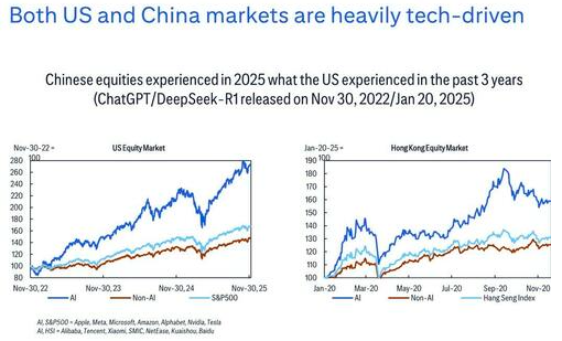 这家美国知名投行将2022年11月ChatGPT的问世与今年1月DeepSeek-R1的发布进行对比后得出结论,“中国股市在2025年所经历的,正是美国市场在过去3年所经历的。”