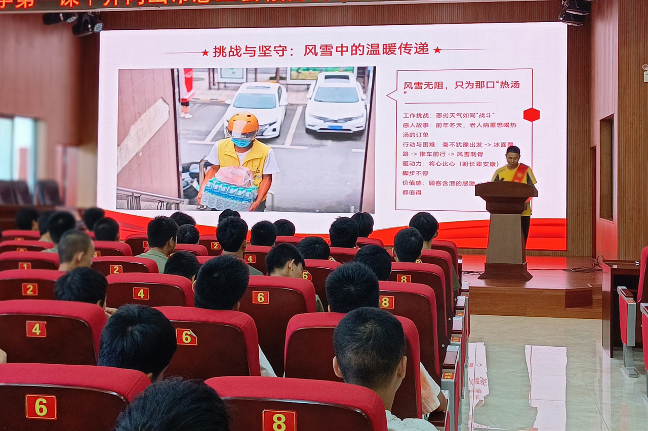 龙建平以《平凡岗位亦有光 外卖路上绽芳华》为主题,分享了自己作为外卖配送员的别样奋斗路。“外卖箱里装的不只是餐品,更是责任。”龙建平的话简单却有力,让学生们深刻领悟到“平凡岗位从不平凡,劳动价值不分高低”。