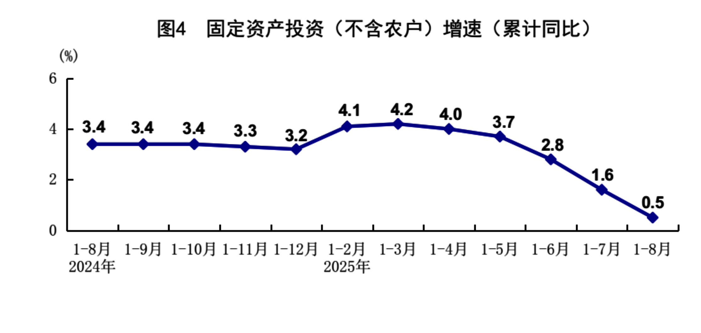1-8月份,全国固定资产投资(不含农户)326111亿元,同比增长0.5%;扣除房地产开发投资,全国固定资产投资增长4.2%。分领域看,基础设施投资同比增长2.0%,制造业投资增长5.1%,房地产开发投资下降12.9%。全国新建商品房销售面积57304万平方米,同比下降4.7%;新建商品房销售额55015亿元,下降7.3%。分产业看,第一产业投资同比增长5.5%,第二产业投资增长7.6%,第三产业投资下降3.4%。民间投资同比下降2.3%;扣除房地产开发投资,民间投资增长3.0%。高技术产业中,信息服务业,航空、航天器及设备制造业,计算机及办公设备制造业投资同比分别增长34.1%、28.0%、12.6%。8月份,固定资产投资(不含农户)环比下降0.20%。