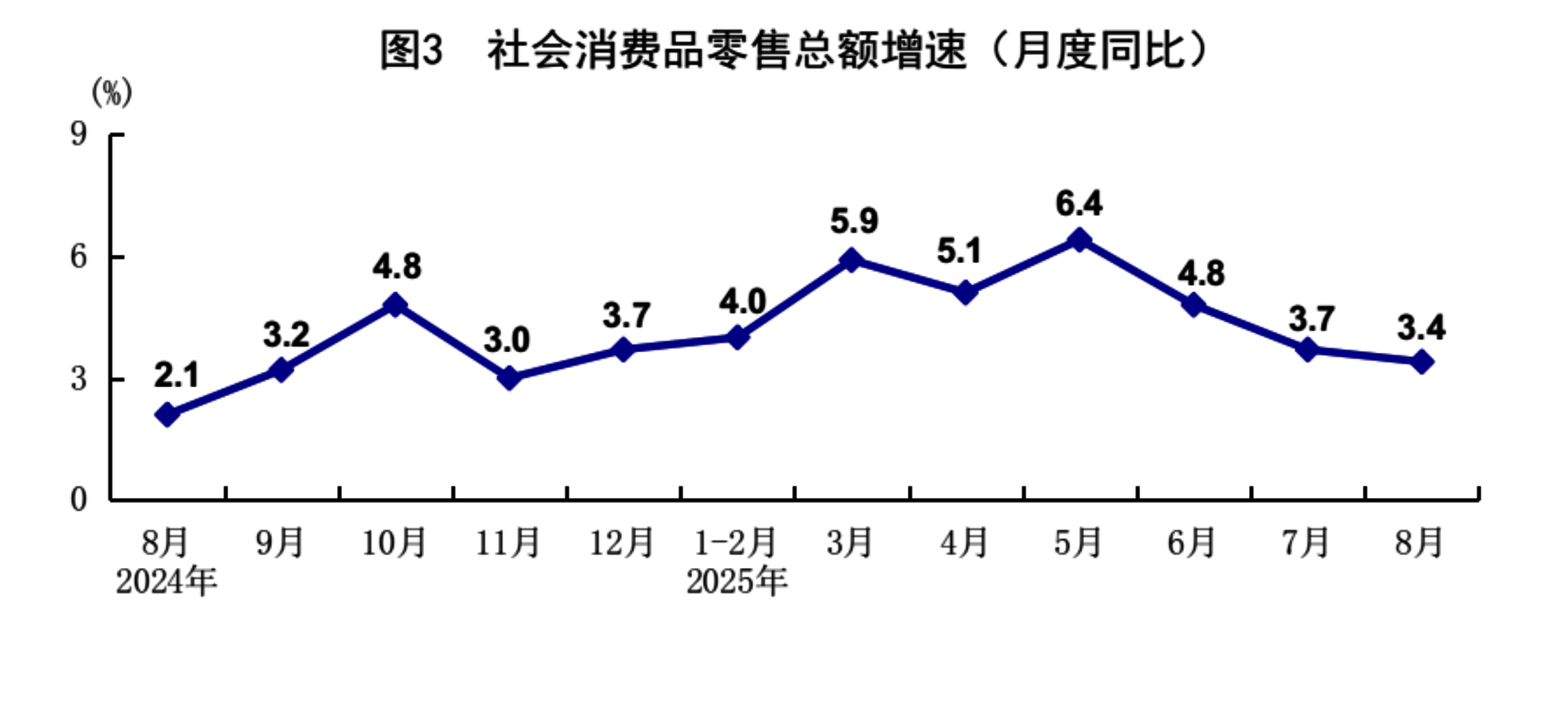 8月份,社会消费品零售总额39668亿元,同比增长3.4%;环比增长0.17%。按经营单位所在地分,城镇消费品零售额34387亿元,同比增长3.2%;乡村消费品零售额5281亿元,增长4.6%。按消费类型分,商品零售额35172亿元,增长3.6%;餐饮收入4496亿元,增长2.1%。基本生活类和部分升级类商品销售增势良好,限额以上单位日用品类、粮油食品类、体育娱乐用品类商品零售额分别增长7.7%、5.8%、16.9%。消费品以旧换新政策效果继续显现,限额以上单位家具类、家用电器和音像器材类、文化办公用品类、通讯器材类商品零售额分别增长18.6%、14.3%、14.2%、7.3%。1-8月份,社会消费品零售总额323906亿元,同比增长4.6%。全国网上零售额99828亿元,同比增长9.6%。其中,实物商品网上零售额80964亿元,增长6.4%,占社会消费品零售总额的比重为25.0%。1-8月份,服务零售额同比增长5.1%。其中,文体休闲服务类、旅游咨询租赁服务类、交通出行服务类零售额较快增长。