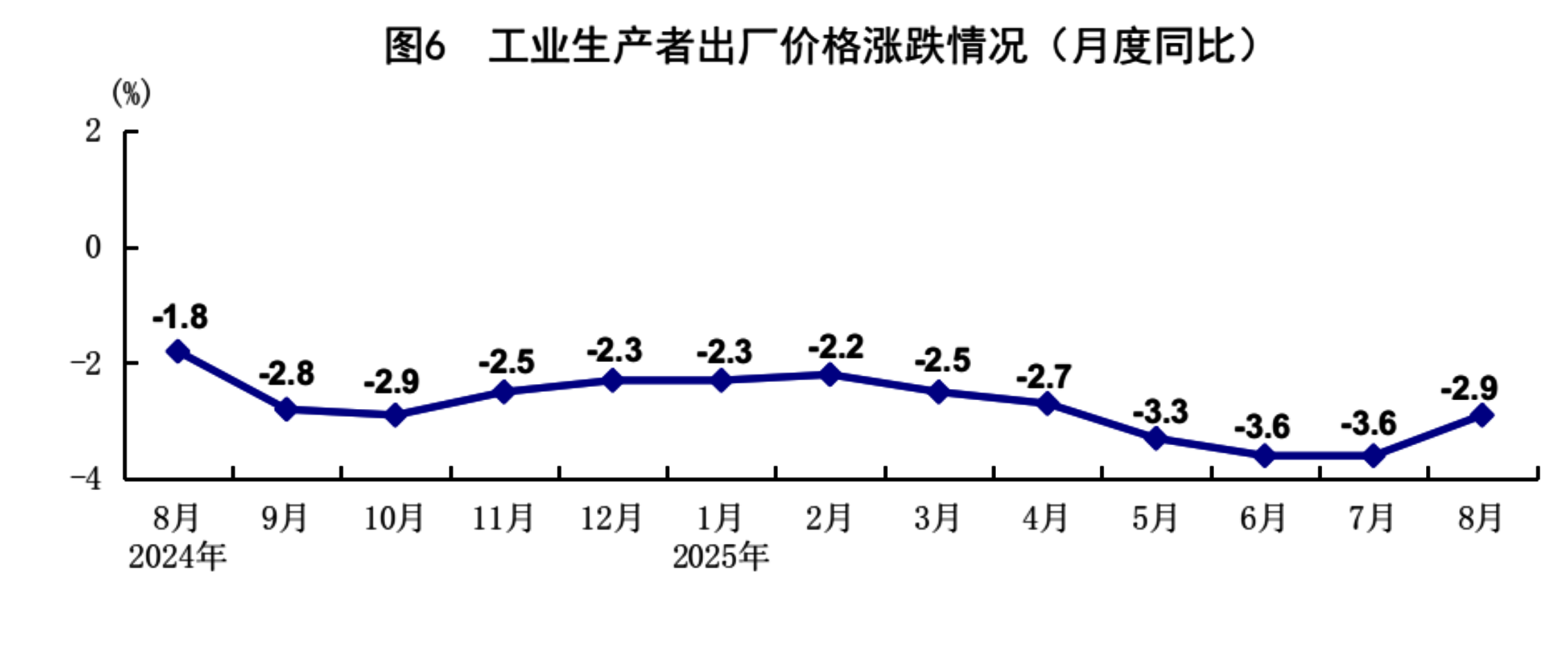 8月份,全国工业生产者出厂价格同比下降2.9%,降幅比上月收窄0.7个百分点,环比持平;全国工业生产者购进价格同比下降4.0%,降幅收窄0.5个百分点,环比持平。1-8月份,全国工业生产者出厂价格和购进价格同比分别下降2.9%、3.3%。