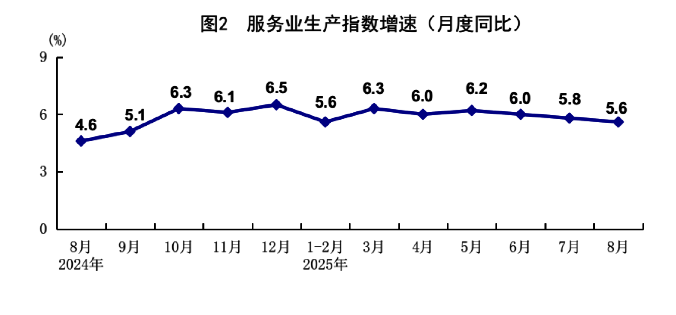 8月份,全国服务业生产指数同比增长5.6%。分行业看,信息传输、软件和信息技术服务业,金融业,租赁和商务服务业生产指数同比分别增长12.1%、9.2%、7.4%,分别快于服务业生产指数6.5、3.6、1.8个百分点。1-8月份,全国服务业生产指数同比增长5.9%。1-7月份,规模以上服务业企业营业收入同比增长7.4%。8月份,服务业商务活动指数为50.5%,比上月上升0.5个百分点;服务业业务活动预期指数为57.0%,上升0.4个百分点。其中,铁路运输、水上运输、航空运输、电信广播电视及卫星传输服务、资本市场服务等行业商务活动指数位于60.0%以上高位景气区间。