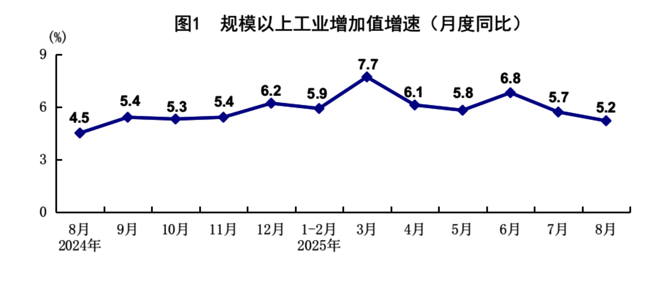 8月份,全国规模以上工业增加值同比增长5.2%,环比增长0.37%。分三大门类看,采矿业增加值同比增长5.1%,制造业增长5.7%,电力、热力、燃气及水生产和供应业增长2.4%。装备制造业增加值同比增长8.1%,高技术制造业增加值增长9.3%,分别快于全部规模以上工业增加值2.9和4.1个百分点。分经济类型看,国有控股企业增加值同比增长4.7%;股份制企业增长6.0%,外商及港澳台投资企业增长2.3%;私营企业增长4.6%。分产品看,3D打印设备、新能源汽车、工业机器人等产品产量同比分别增长40.4%、22.7%、14.4%。1-8月份,全国规模以上工业增加值同比增长6.2%。8月份,制造业采购经理指数为49.4%,比上月上升0.1个百分点;企业生产经营活动预期指数为53.7%,上升1.1个百分点。1-7月份,全国规模以上工业企业实现利润总额40204亿元,同比下降1.7%。