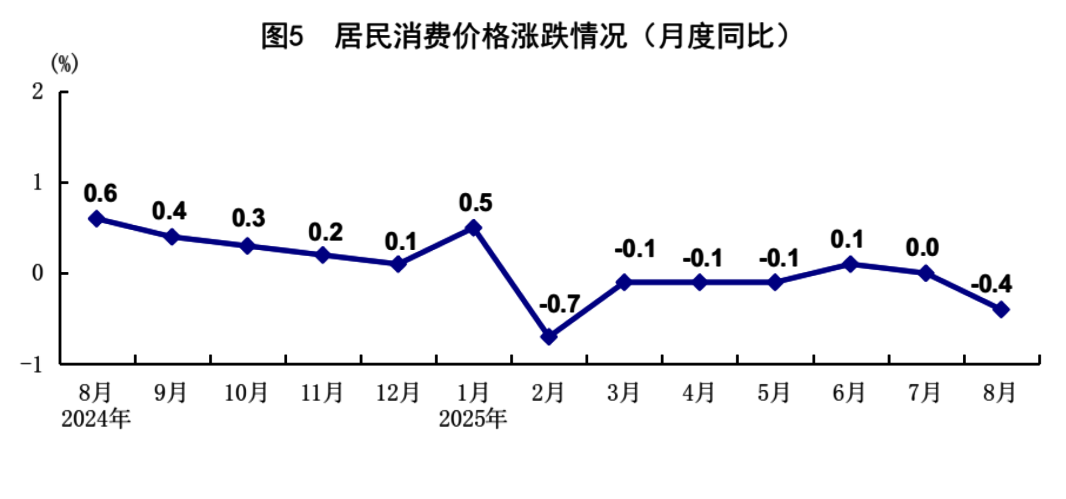8月份,全国居民消费价格(CPI)同比下降0.4%,环比持平。分类别看,食品烟酒价格同比下降2.5%,衣着价格上涨1.8%,居住价格上涨0.1%,生活用品及服务价格上涨1.8%,交通通信价格下降2.4%,教育文化娱乐价格上涨1.0%,医疗保健价格上涨0.9%,其他用品及服务价格上涨8.6%。在食品烟酒价格中,猪肉价格下降16.1%,鲜菜价格下降15.2%,鲜果价格下降3.7%,粮食价格下降0.8%。扣除食品和能源价格后的核心CPI同比上涨0.9%,涨幅比上月扩大0.1个百分点。1-8月份,全国居民消费价格同比下降0.1%。